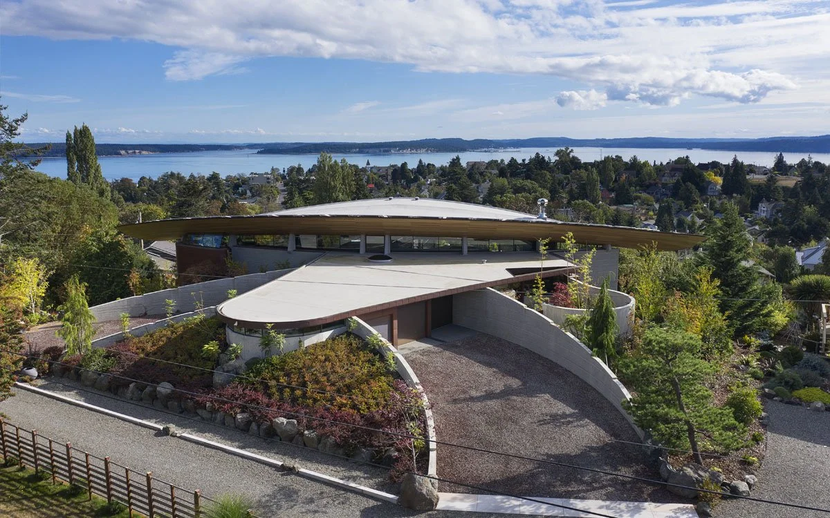 An elegant solution for a narrow and complex forested site, this project was designed with a peek-a-boo view of the Puget Sound.